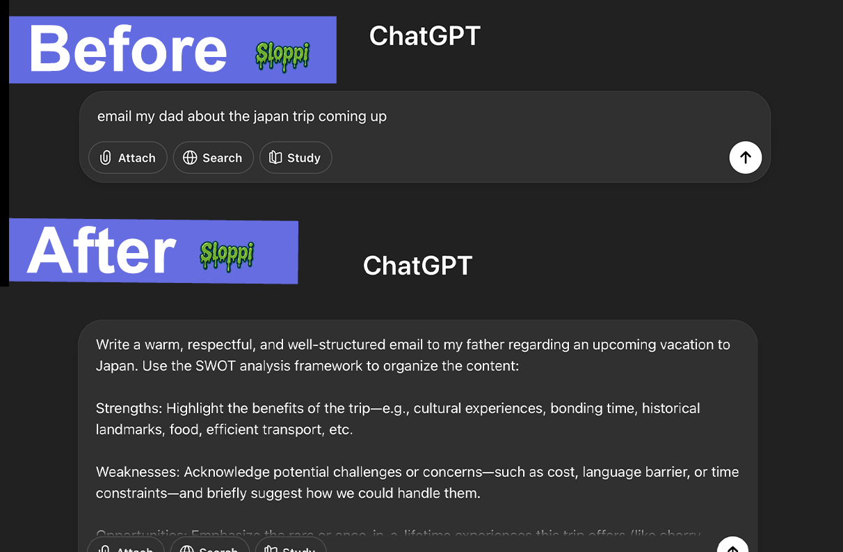 Simple, effective, and surprisingly fun to use. Sloppi takes the stress out of prompting and replaces it with a framework that actually boosts creativity. If you rely on AI for work (or pleasure), this is a must-have.
